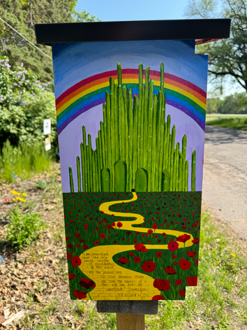 This is the Little Free Library at my home. It took me a few years to paint and install it. This project was often delayed as I prioritized other tasks, but I finally decided to complete it and install it in the spring of 2024. I have received wonderful feedback from the people who stop by to visit my library. They love the artwork and the messaging, and many have mentioned that they don’t often see Little Free Libraries that are hand-painted like this one.